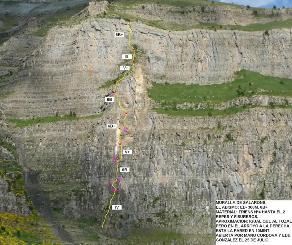 Muralla del Circo de Salarons, junto al Tozal, pared eclipsada por las grandes de Ordesa. «Una ruta de aventura no muy dificil pero obligada y expuesta en algún tramo, se recomienda ir rodado en Ordesa…» Por su orientación, la vía es recomendable para estos días de calor.